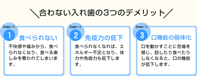 合わない入れ歯をしていると様々な弊害が発生します。まず始めに顎がやせ細り、鈎歯(クラスプがかかっている歯)の負担が増大します。さらに口内の粘膜は傷付けられ、常に口内炎にかかっているような状態になります。その状態に加えて噛み合わせまで合っていなければ、ズレた入れ歯によって傷がさらに刺激され、激痛を伴います。そんな痛みを抱えていては、快適な生活をおくることはとても困難です。しっかりとした検査とカウンセリングを行い、自分に合った入れ歯でよりよい素敵な生活を送りましょう。